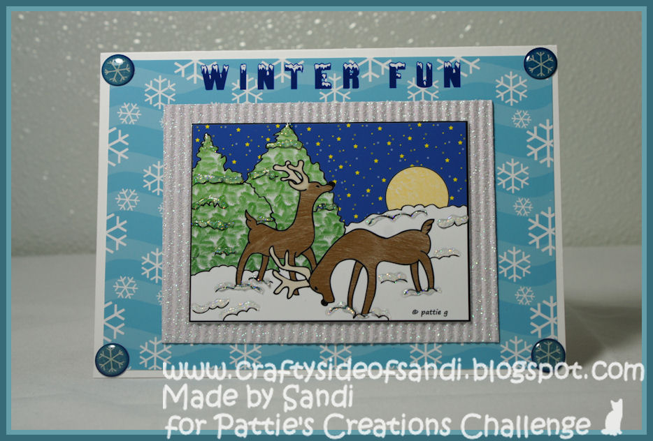 Our theme for Challenge #59 is FUN IN THE SNOW. It is Our Rule that you also include any Digital or Stamped Image on your creation! Stop on over to Pattie's ETSY Shop and have a look at her many images. Don't forget to check out the Freebie First Friday of the Month page up above on the menu bar. The Freebie will be available for 2 days only, and then it will be removed from the site!
